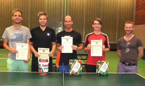 Im Finale kurz nach 23.00 Uhr bei immer noch über 30 Grad in der Halle war F. Ballman der Favorit, auch weil er in der Gruppenphase bereits klar gegen F. Blischke gewonnen hatte. Doch dieser wehrte sich jetzt kräftig, musste aber nach gewonnenem ersten Satz die nächsten drei jeweils nach Führungen, alle in der Verlängerung abgeben. Somit stand F. Ballmann in dessen Adern ganz viel TT-Blut fließt, (Vater, Mutter und Schwester sind alle ganz hervorragende Spieler) als neuer Baulandmeister fest. Gratulation.