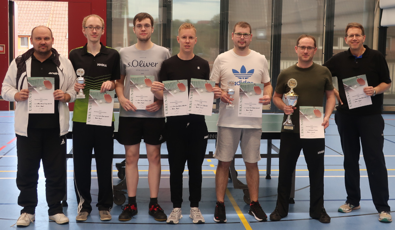 Sehr spannend verlief die Doppelkonkurrenz, in der die Partner nach TTR-Leistungsstärke zusammengestellt wurden. Nach der unglaublich engen Gruppenphase, kam es zum Halbfinale, Kuhn/Kirchhoff, gegen Daitche/Niemann, in dem die erstgenannten nach hartem Kampf, mit 3:2 siegreich waren. Im zweiten Halbfinale gewannen Zinkel/Krönlein, mit 3:1, gegen Falkenstein/Gehrig. Das Finale war dann etwas deutlicher und Kuhn/Kirchhoff, konnten sich dort mit 3:1, den Titel sichern. Im Anschluss an die Siegerehrung, gab es noch ein gemütliches Beisammensein.